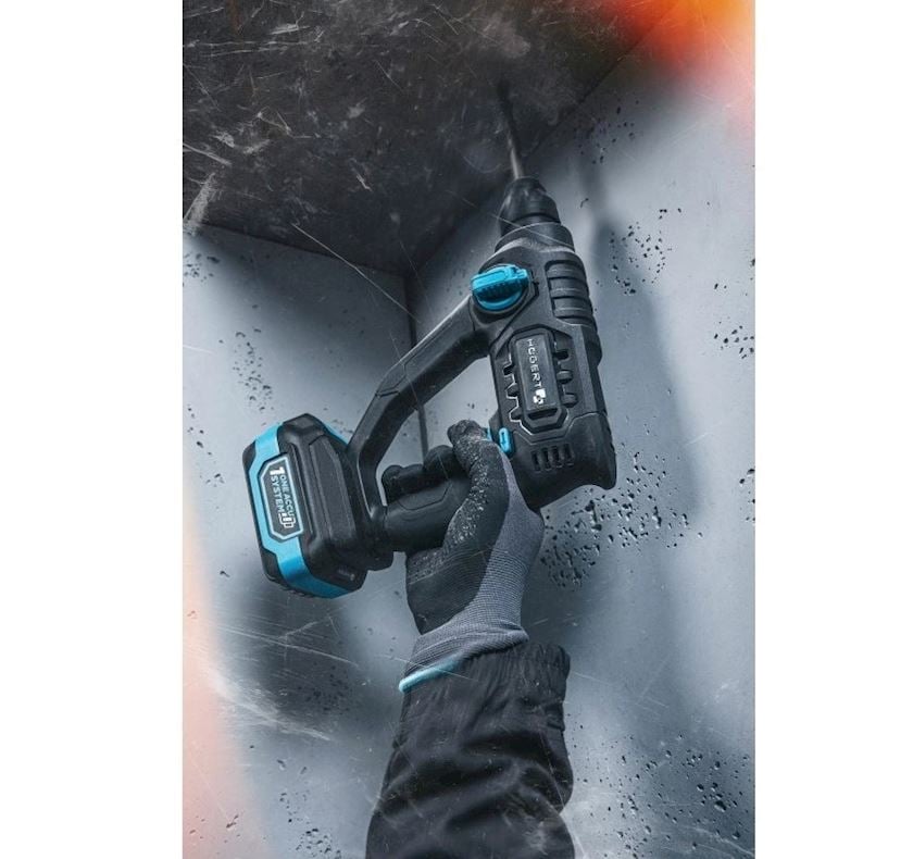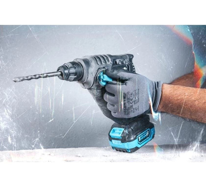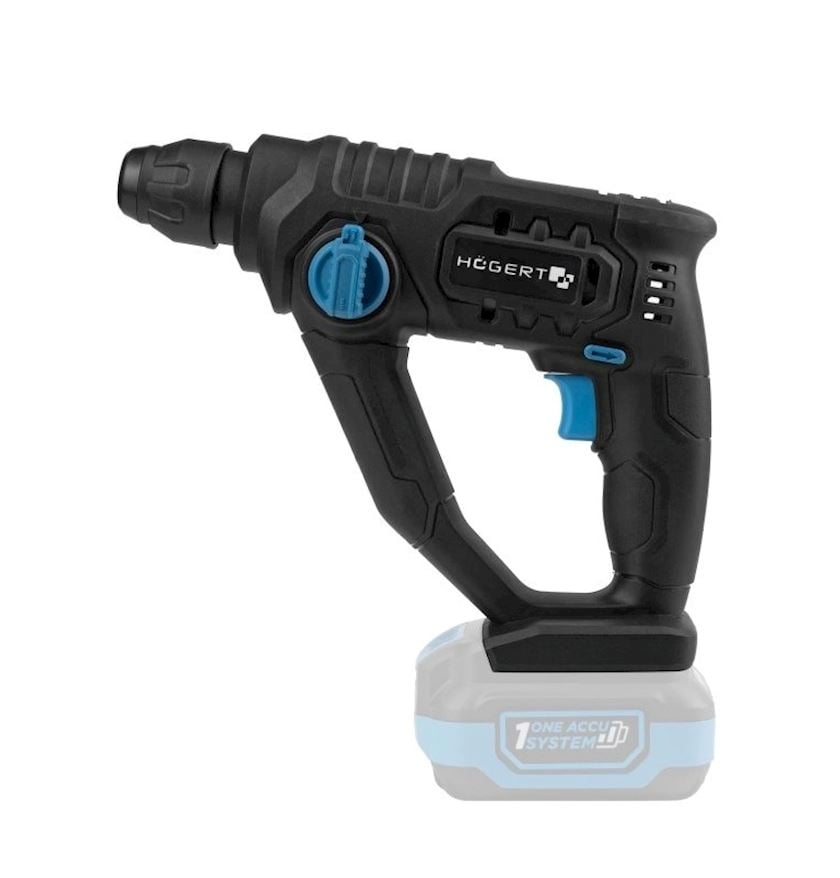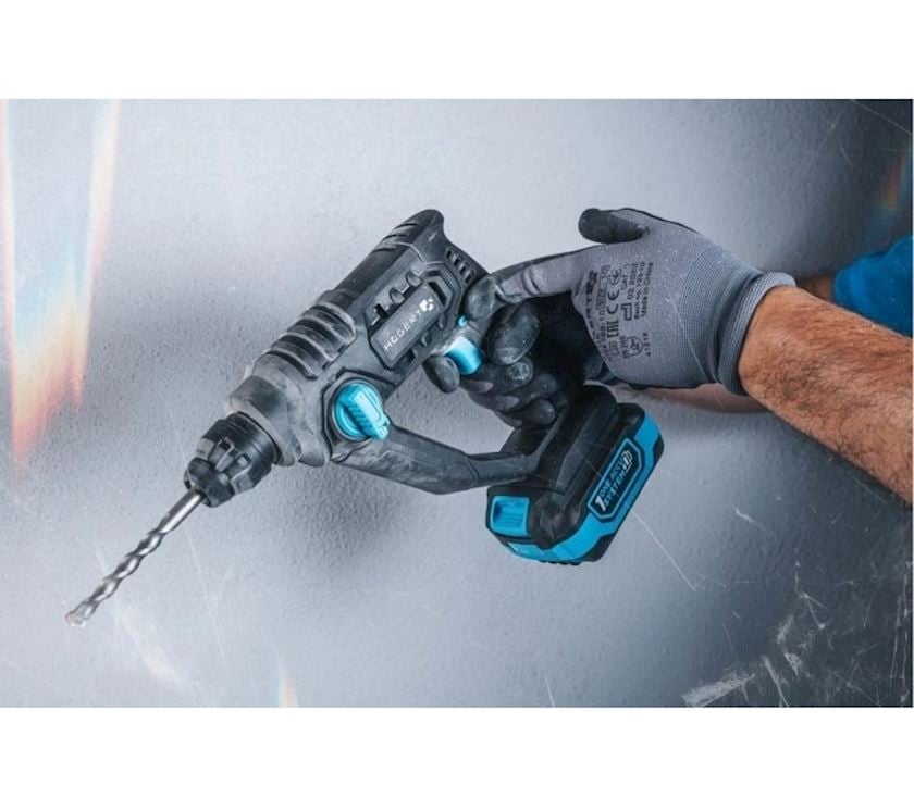 Тип патрона - СДС+. Энергия 1,5 Дж. Скорость: 0-910 об/мин. Частота хода: 0-5100 дюйм/мин. Максимальный диаметр сверления в древесине – 25 мм. Максимальный диаметр сверления в стали – 10 мм. Максимальный диаметр сверления в бетоне – 12 мм. Металлический зубчатый механизм. Светодиодная подсветка. Плавная регулировка скорости на переключателе. Мягкая ручка. Переключатель для вращения по часовой стрелке и против часовой стрелки. Вес – 1,35 кг. Аккумуляторная батарея продается отдельно. EAN-код: 5902801441431. Гарантия 3 года (после регистрации прибора). OneAccuSystem. Напряжение - 18 В. Выбор функций: безударное сверление, ударное сверление.