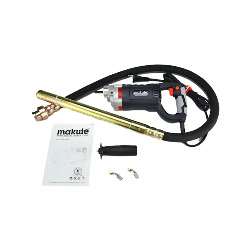 Глубинный вибратор Makute CV001 мощностью 960 Вт и максимальным числом оборотов 4600 об/мин. Он ударный, работает от сети 220В. Подходит для работы с бетоном. Черного цвета, профессиональный вид, произведен в Китае. Не имеет реверса, угловой конструкции, кейса и аккумуляторов.