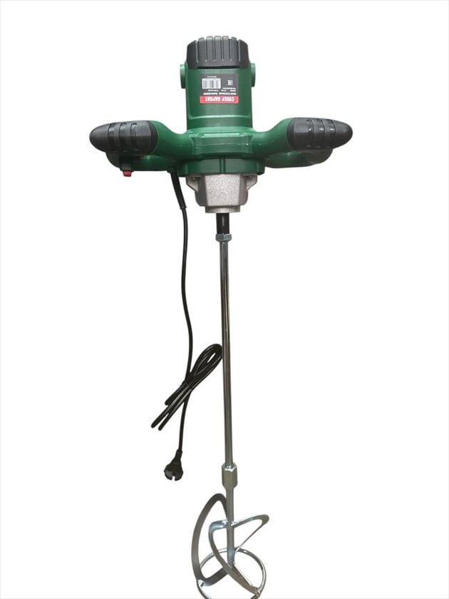 На фотографии представлен электрический строительный миксер. Назначение: • Применяется в строительстве и ремонте для перемешивания красок, гипса, штукатурки, клея, цементного раствора и других жидких и полужидких смесей. • Двухручная конструкция обеспечивает стабильное и удобное управление при работе. Технические характеристики на этикетке: • Модель: KEM001 • Мощность: 2600 Вт • Напряжение: 220 В / 50 Гц • Скорость вращения: 0–800 об/мин (регулируется) • Производство: Китай (на этикетке указано «Made in PRC»)