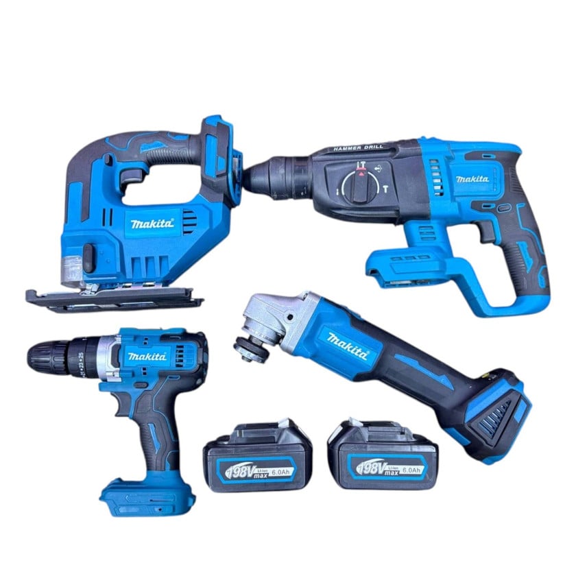 Набор электроинструментов Makita (шуруповёрт, лагонда, лобзик, перфоратор) Профессиональный набор электроинструментов Makita включает шуруповёрт, лагонду, лобзик и перфоратор — всё необходимое для широкого спектра строительных и ремонтных работ. Шуруповёрт обеспечивает быстрое и точное завинчивание крепежа, лагонда используется для резки и подгонки деталей, лобзик подходит для аккуратного распила древесины, пластика и металла, а перфоратор эффективно справляется с бурением и долблением твёрдых материалов. Инструменты Makita отличаются высокой мощностью, долговечностью и эргономичным дизайном. Удобные прорезиненные рукоятки снижают усталость при работе, а прочная конструкция гарантирует долгий срок службы. Идеальное решение как для профессионалов, так и для домашнего использования.