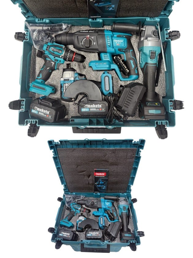 Аккумуляторный бесщеточный перфоратор Makota: Напряжение аккумулятора: 68 В. Емкость аккумулятора: 5 А*ч. Наличие быстросменного патрона: нет. Вес нетто: 4.8 кг. Тип хвостовика: sds-plus. Количество режимов: 3. Сила удара: 2.0 Дж. Max диаметр сверления (металл): 16 мм. Угловая шлифовальная машина 125мм Makota: Напряжение аккумулятора, В: 68v. Диаметр круга, мм: